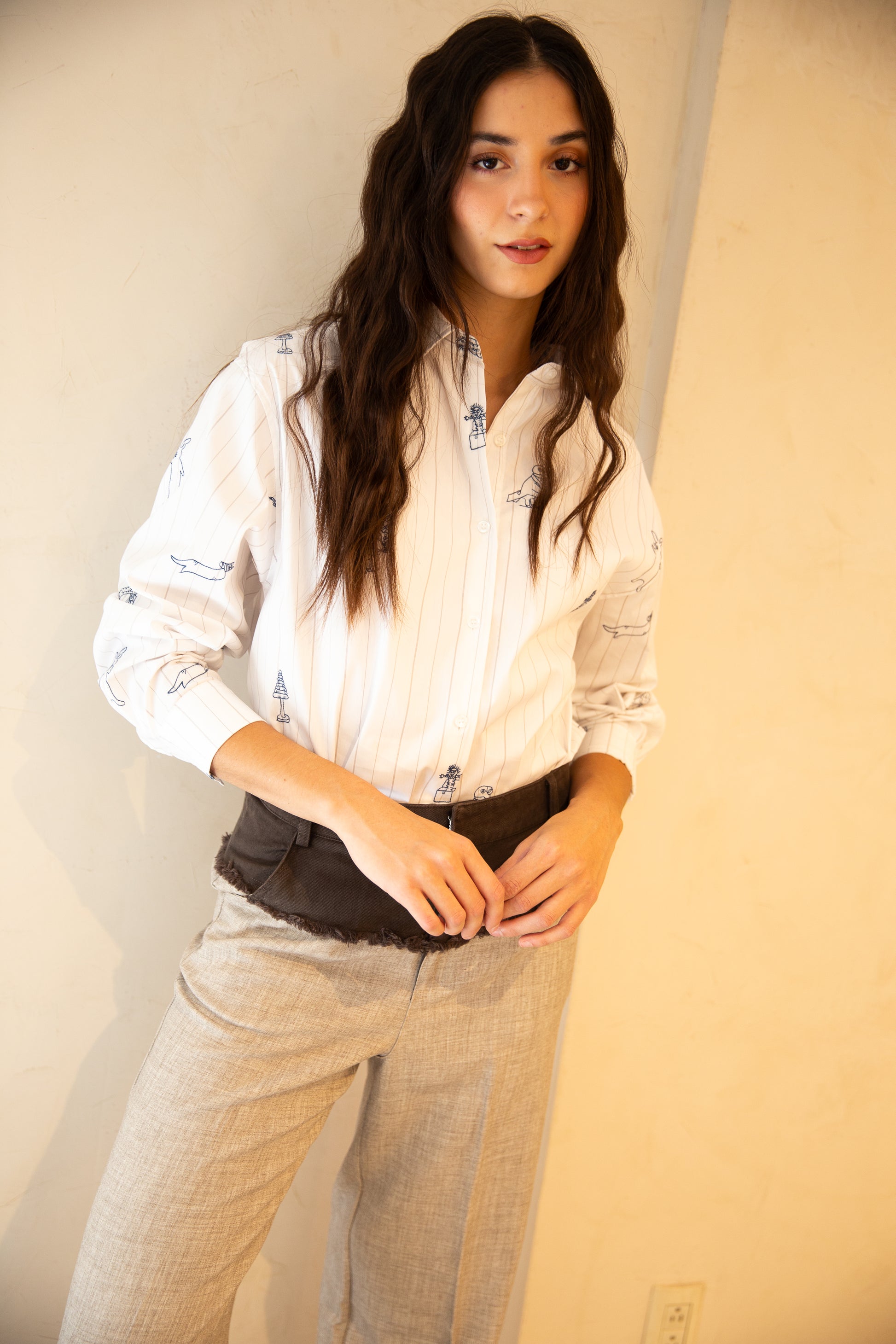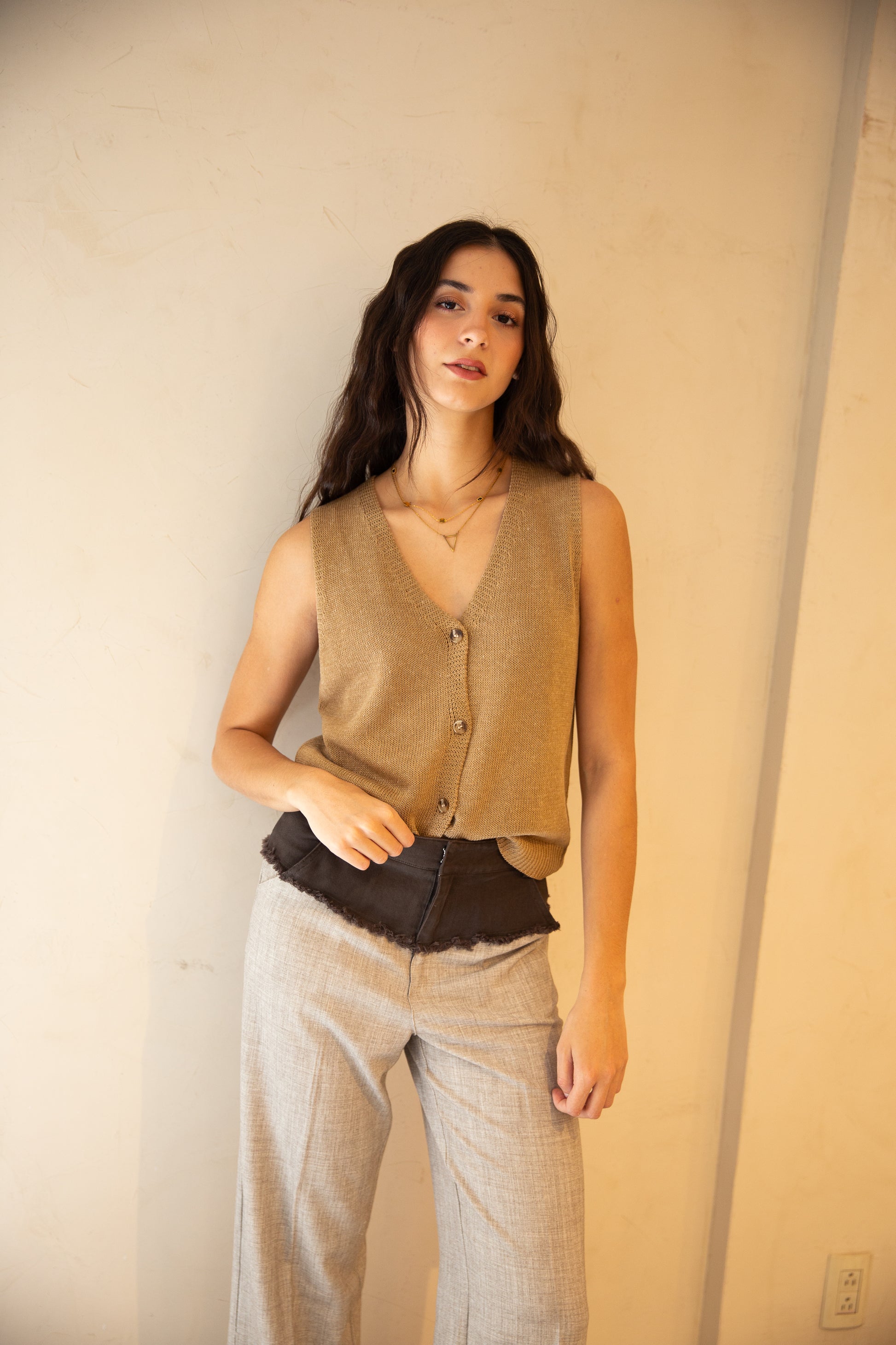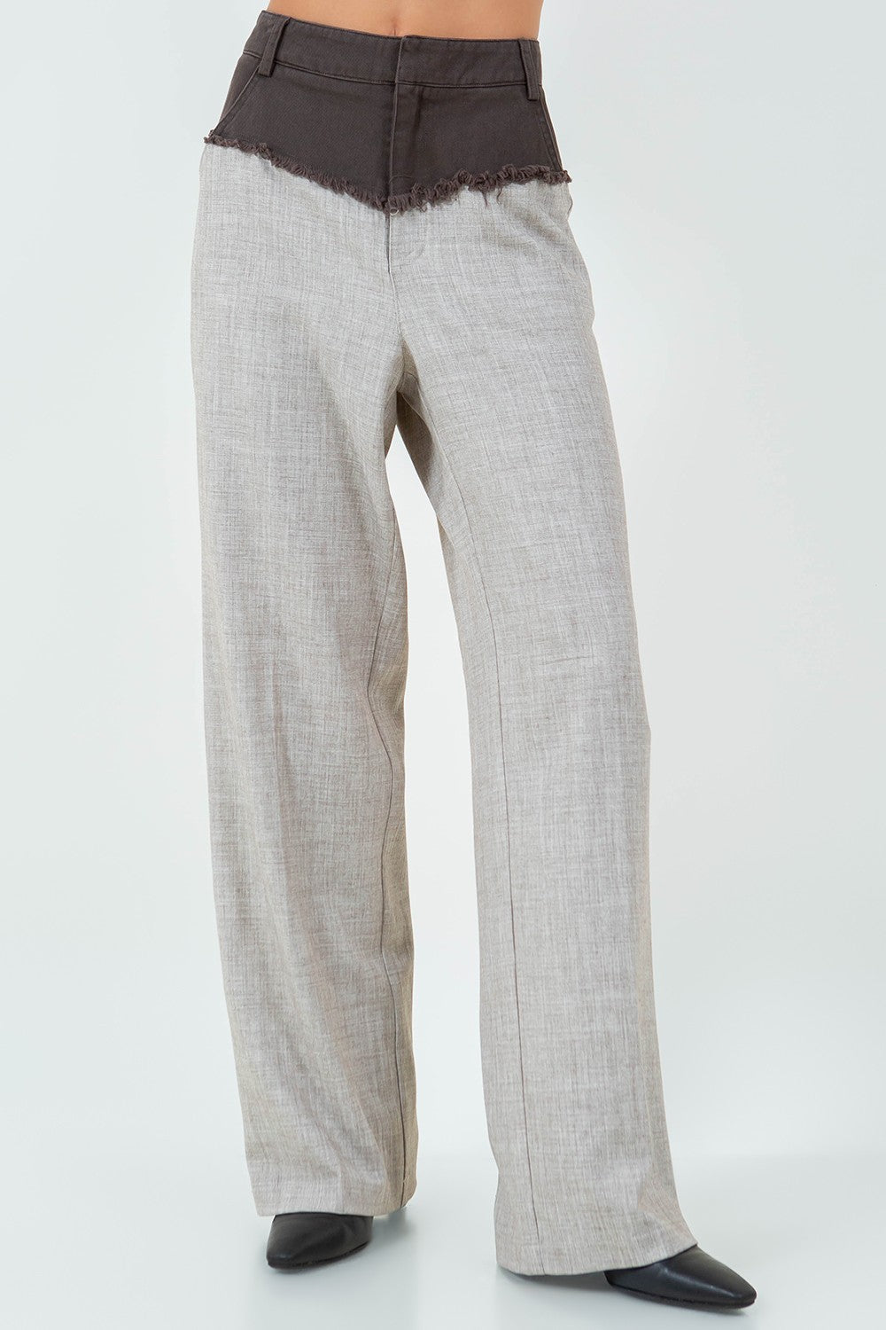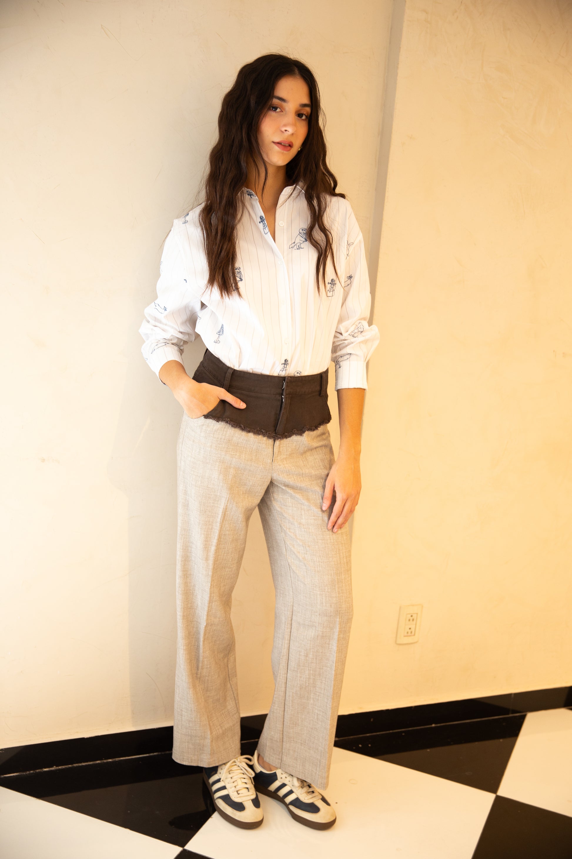 Este pantalón de pierna recta fusiona lo clásico con un giro contemporáneo gracias a su diseño two-tone. La parte superior en contraste, tipo pretina alta en tono chocolate con acabado deshilachado, crea el efecto visual de llevar dos prendas en una sola. El cuerpo en tono beige claro aporta fluidez y sobriedad, equilibrando la propuesta con elegancia.
