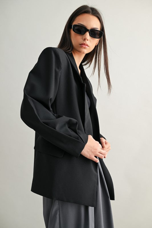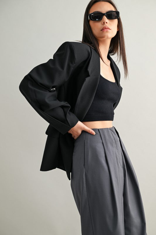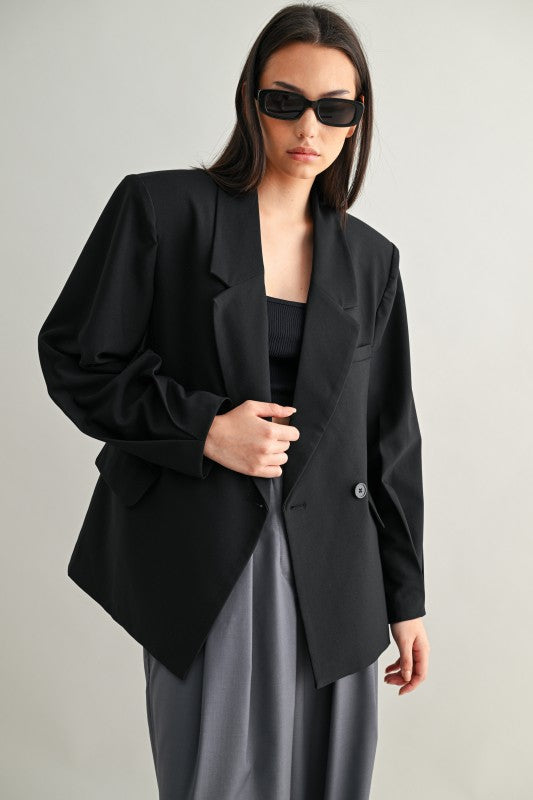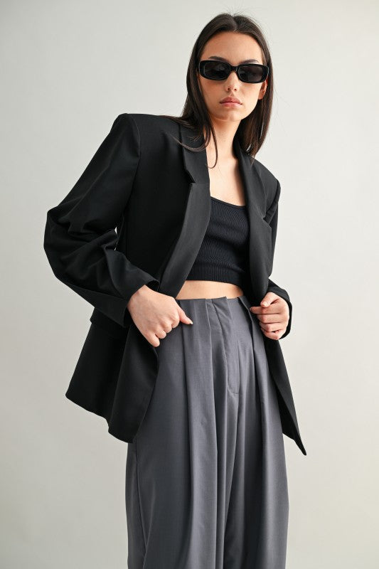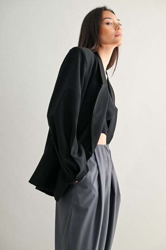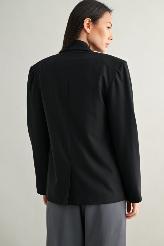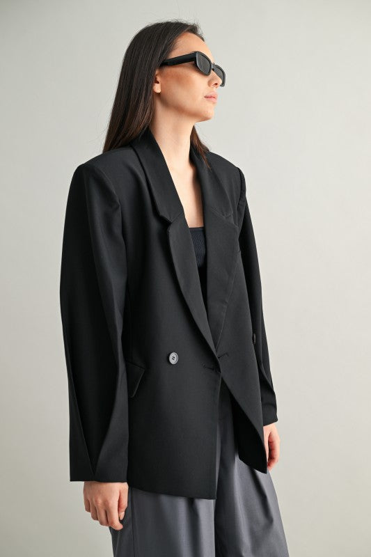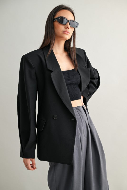 Una blazer tipo saco con silueta oversize y hombros marcados que transmite presencia sin esfuerzo. Su estructura de doble botonadura, detalles de pliegues y forro completo la convierten en una pieza clave para lograr un estilo elegante con toque urbano. Ideal para llevar cerrada como protagonista o abierta sobre looks casuales para darles carácter.