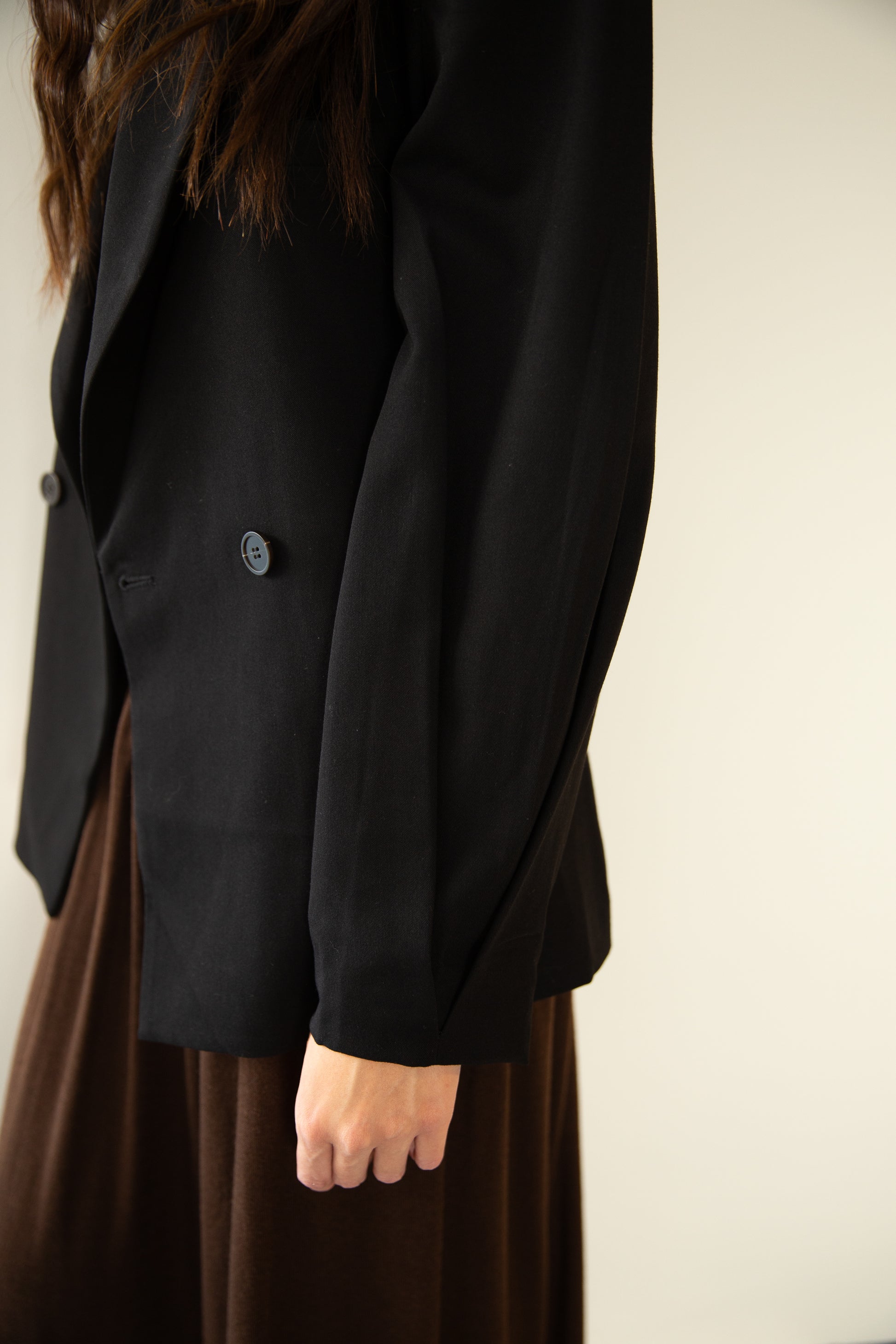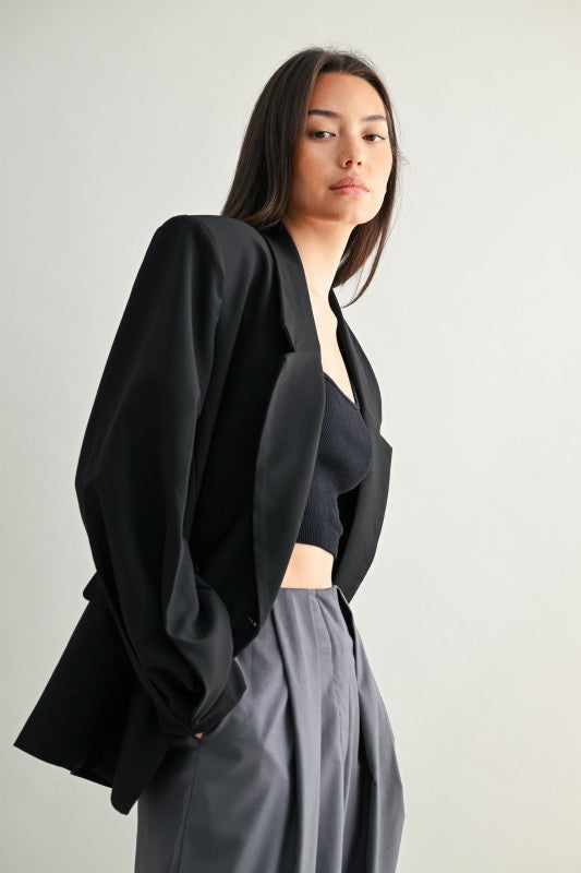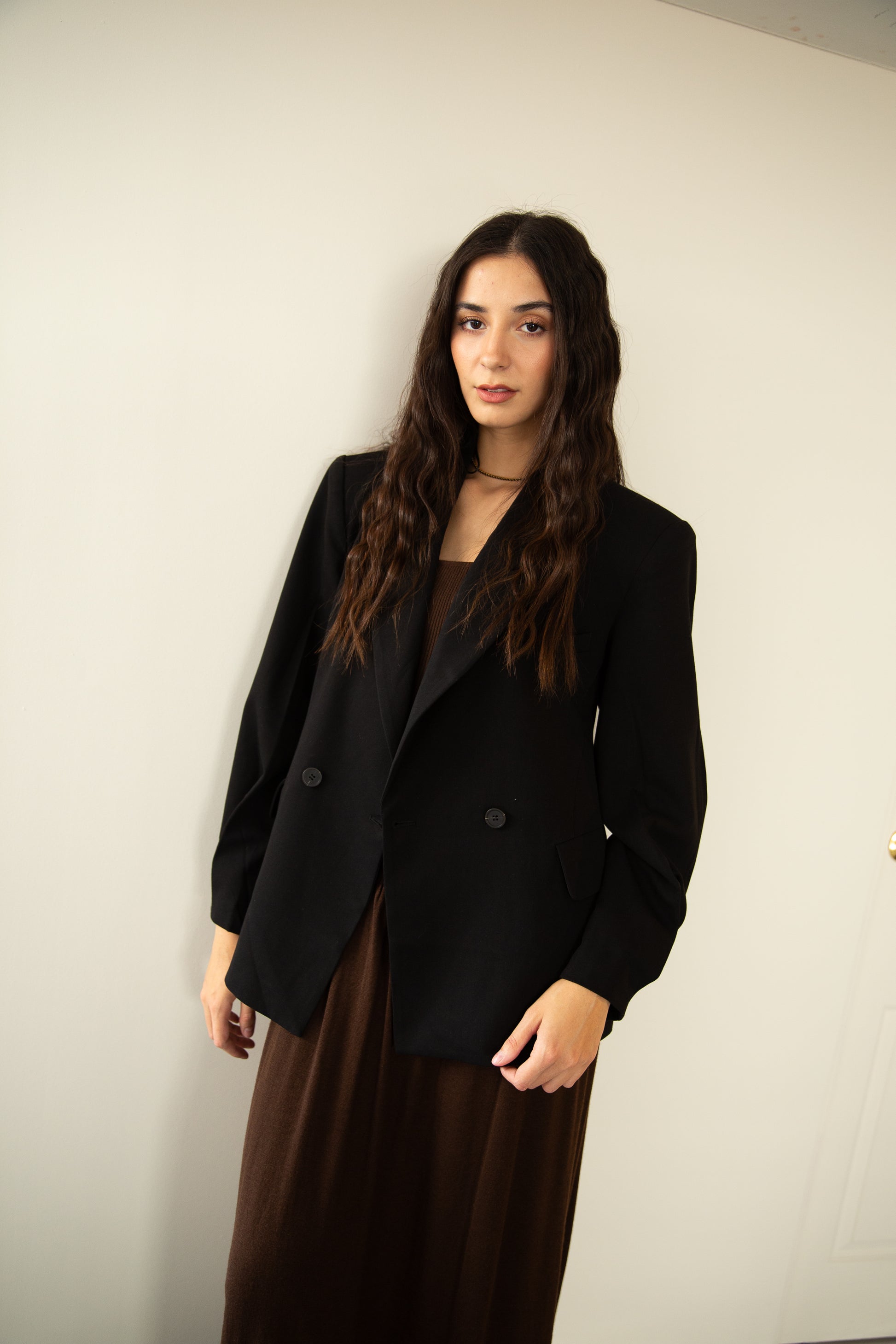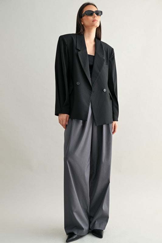 Una blazer tipo saco con silueta oversize y hombros marcados que transmite presencia sin esfuerzo. Su estructura de doble botonadura, detalles de pliegues y forro completo la convierten en una pieza clave para lograr un estilo elegante con toque urbano. Ideal para llevar cerrada como protagonista o abierta sobre looks casuales para darles carácter.