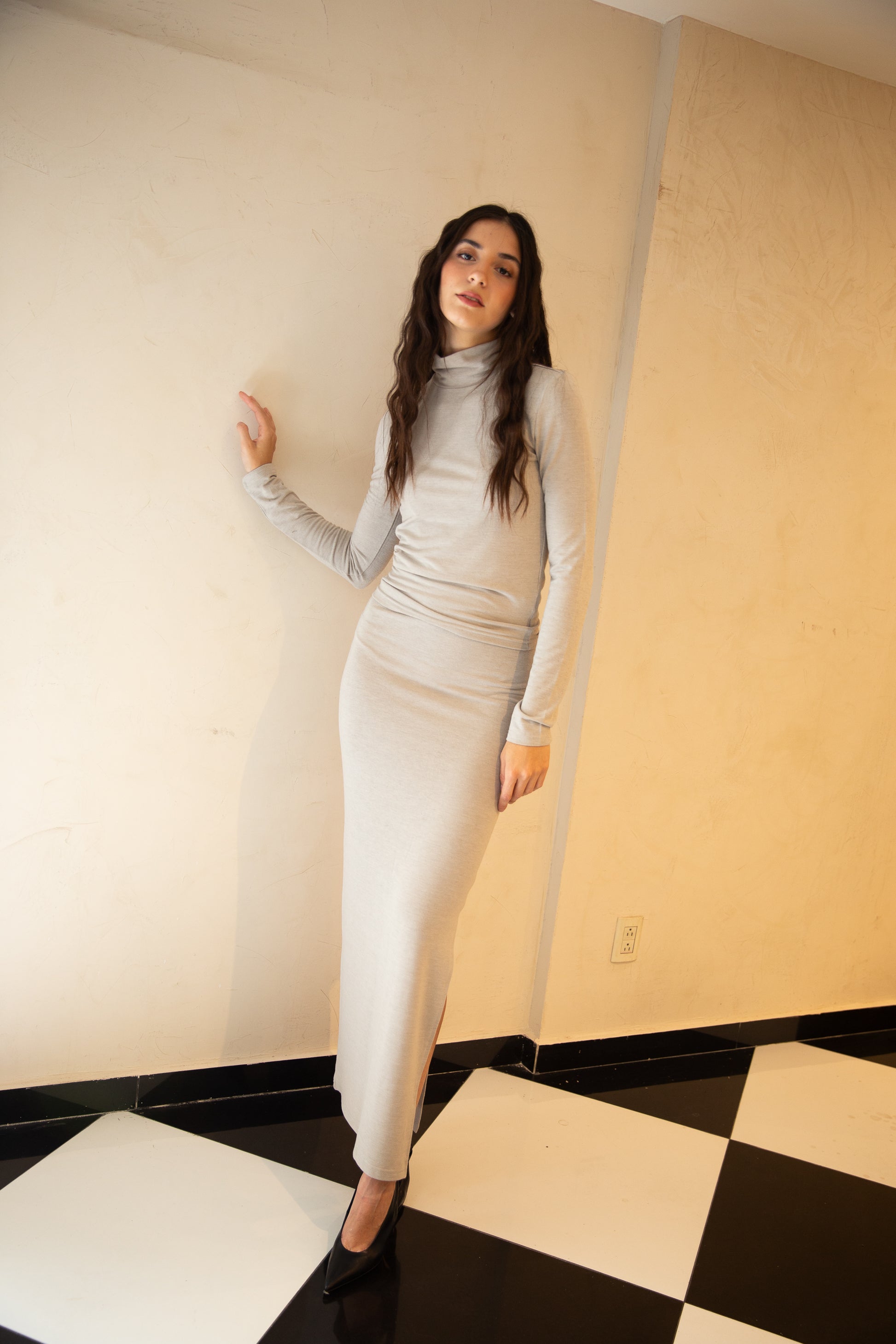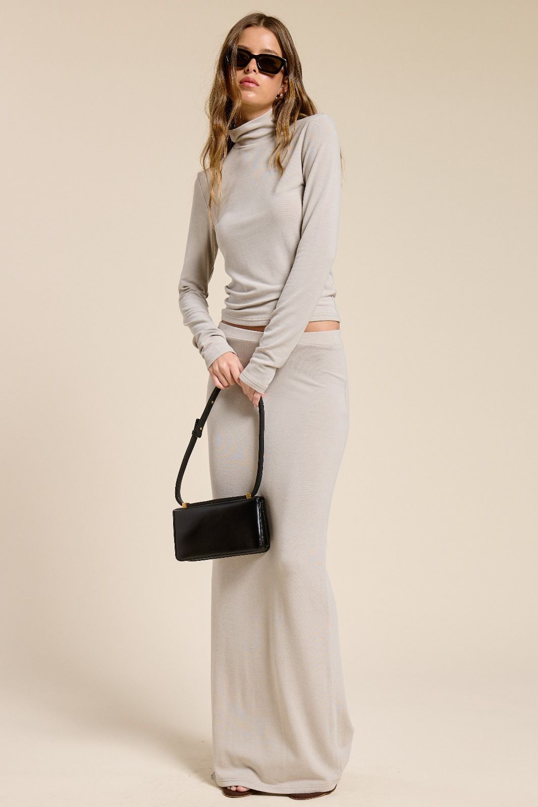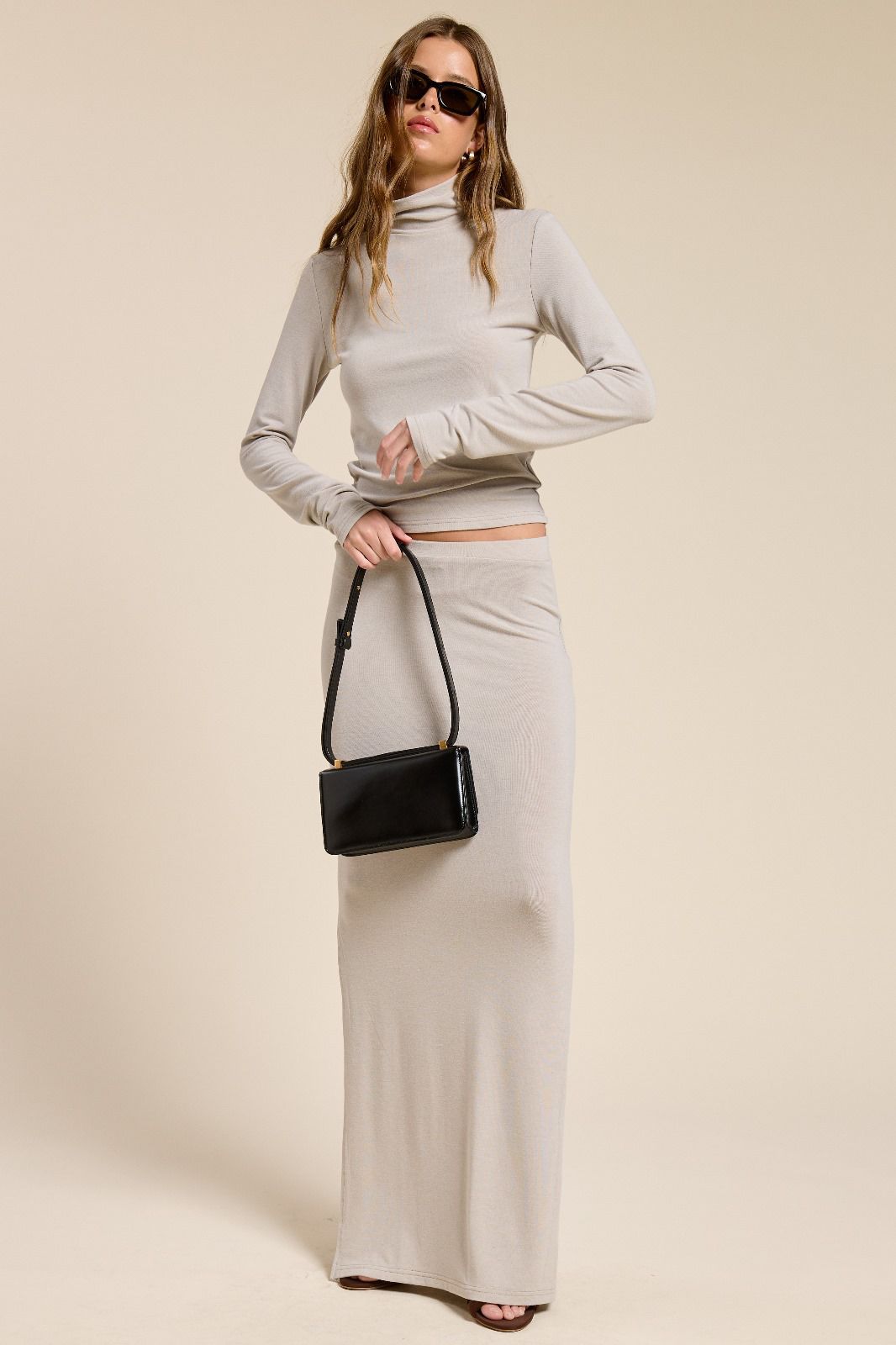 Este conjunto de dos piezas en tono gris claro combina comodidad y elegancia con un estilo minimalista y sofisticado. El top de cuello alto y mangas largas se ajusta suavemente al cuerpo, ideal para usar como capa base en climas fríos o como prenda principal. La falda larga de corte recto y abertura lateral alarga visualmente la silueta y añade un toque sutil de sensualidad. Su tejido ligero y suave se adapta al movimiento y al cuerpo, creando una sensación de calidez con estética limpia.
